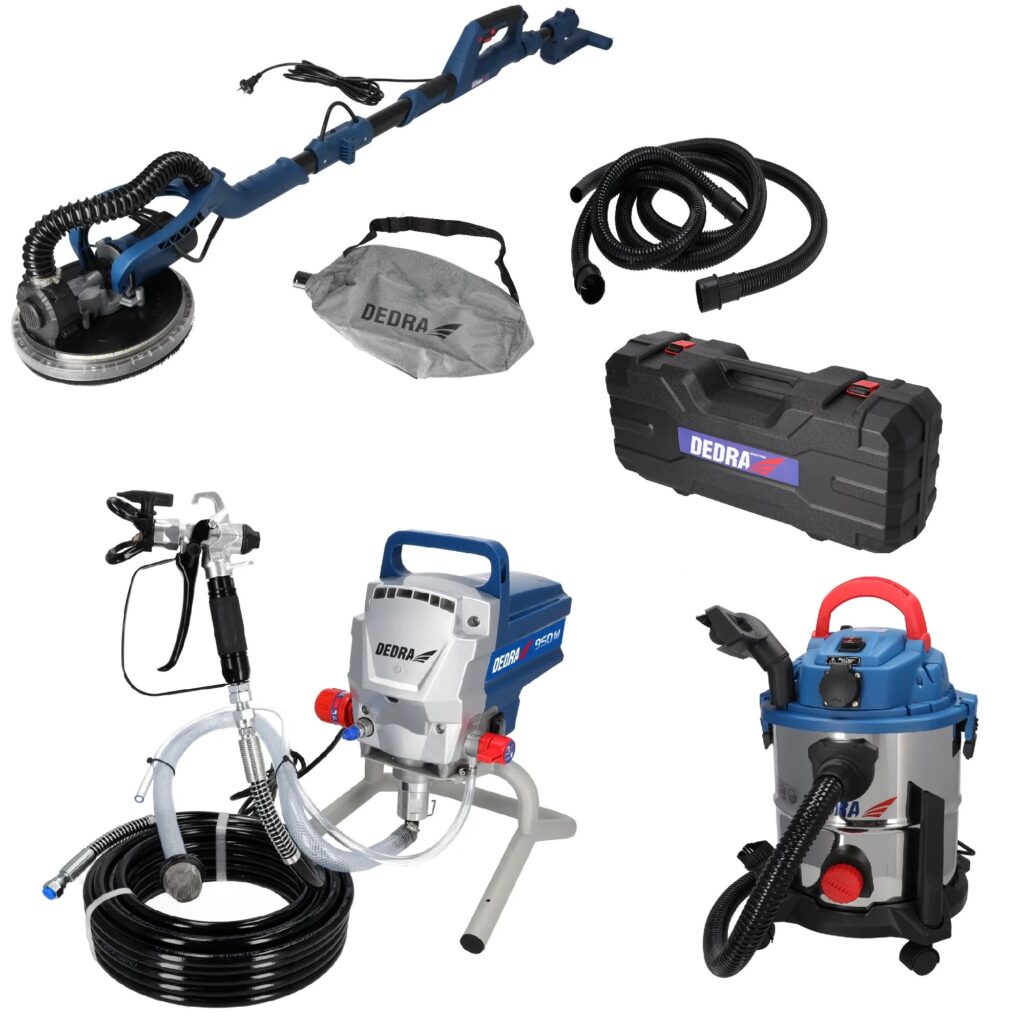 Set – Complet pentru Zugravit/Slefuit (pereti-tavane) – Pompa Airless + Girafa Tavane cu Aspirator (Bobinaj Cupru) – DEDRA Polonia – (DED7424 + DED7766 + DED6597)