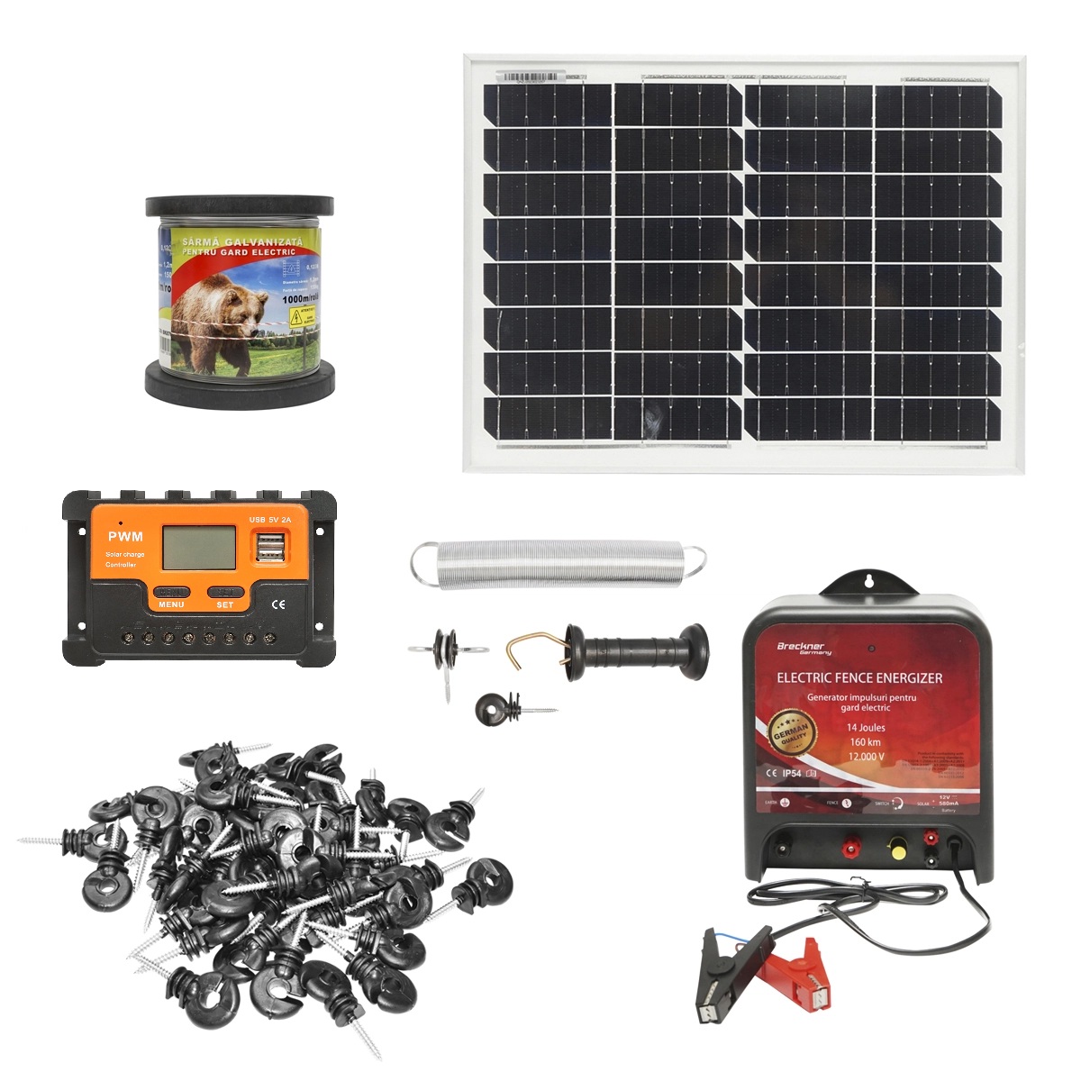 Kit complet gard electric (12V/14 Joule) lungime fir 1000m – 100 izolatori cu panou solar 20W – ROYAL KRAFT Germania (BK87124)